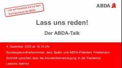 Als im Frühjahr 2020 die erste Welle der Corona-Pandemie über das Land fegte, herrschte Ausnahmezustand in Deutschlands Apotheken. Welche ‚lessons learned‘ gibt es aus der Arzneimittelversorgung während der Pandemie? Diese Frage stand im Zentrum der zweiten Folge von „Lass uns reden! – Der ABDA-Talk“, der am 4. Dezember 2020 live aus dem Deutschen Apothekerhaus über YouTube und Facebook gestreamt wurde. Nach einem Input von ABDA-Vizepräsident Mathias Arnold diskutierten Bundesgesundheitsminister Jens Spahn und ABDA-Präsident Friedemann Schmidt unter der Moderation von Gregor Waschinski (Handelsblatt) über Konsequenzen aus der Pandemie-Erfahrung.